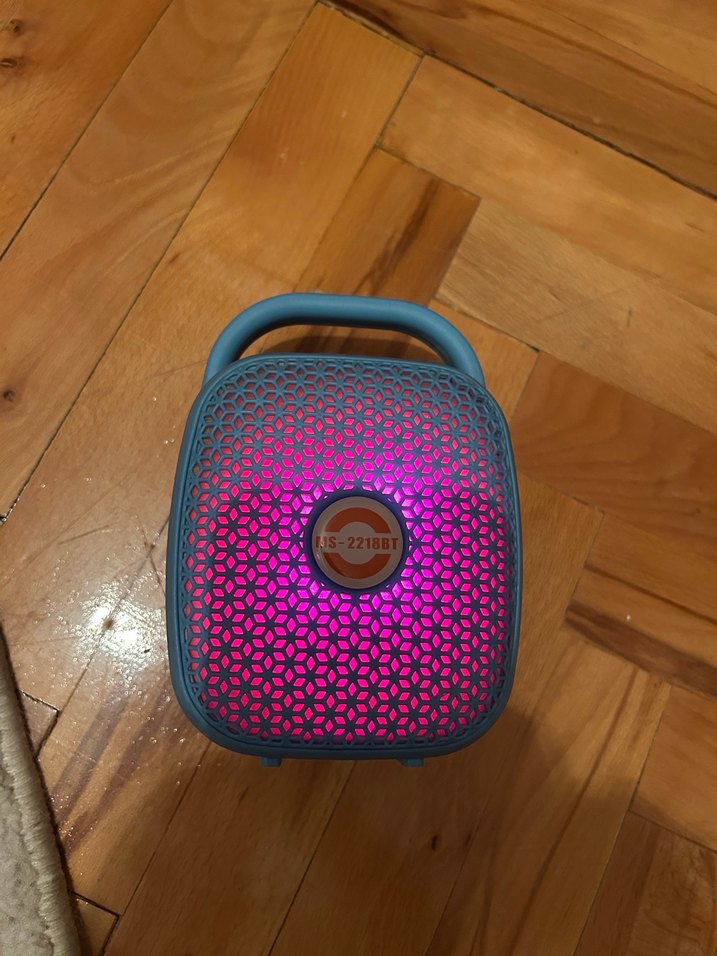 Saplı, renkli ışık efektlerine sahip taşınabilir Bluetooth hoparlör. Kompakt tasarımıyla kolay taşınabilir.