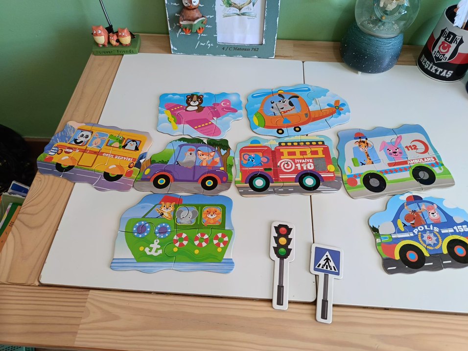 Canlı renklerde çeşitli taşıtlar ve trafik işaretleri içeren çocuk puzzle seti, eğlenceli ve öğretici bir oyun sunar.