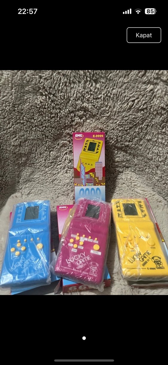 Küçük ekranlı ve kontrol düğmeli renkli taşınabilir oyun konsolları, retro oyunlar için uygundur. Mavi ve sarı renk mevcuttur
