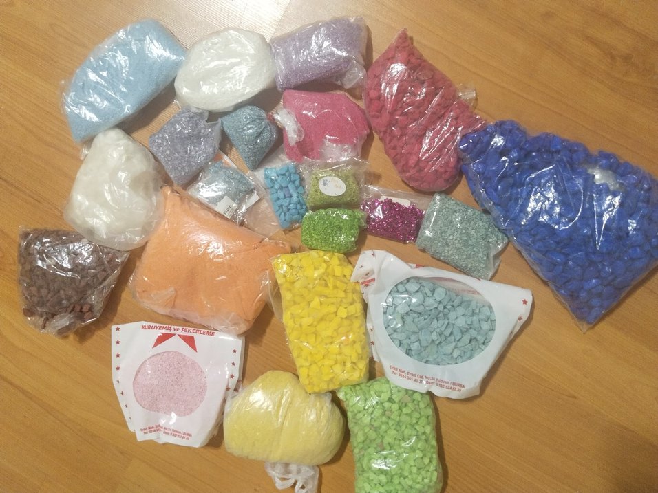 Jel mum yapımında kullandığım renkli taşlar ve kumlar, taşınma nedeniyle uygun fiyata satılıktır. Dekoratif kullanım için idealdir. Toplu satış tercih edilir.