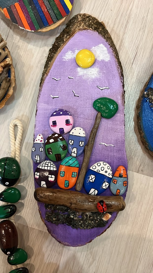 Renkli taşlarla yapılmış, mor ahşap taban üzerinde ev ve doğa figürleri bulunan bir oyuncak.