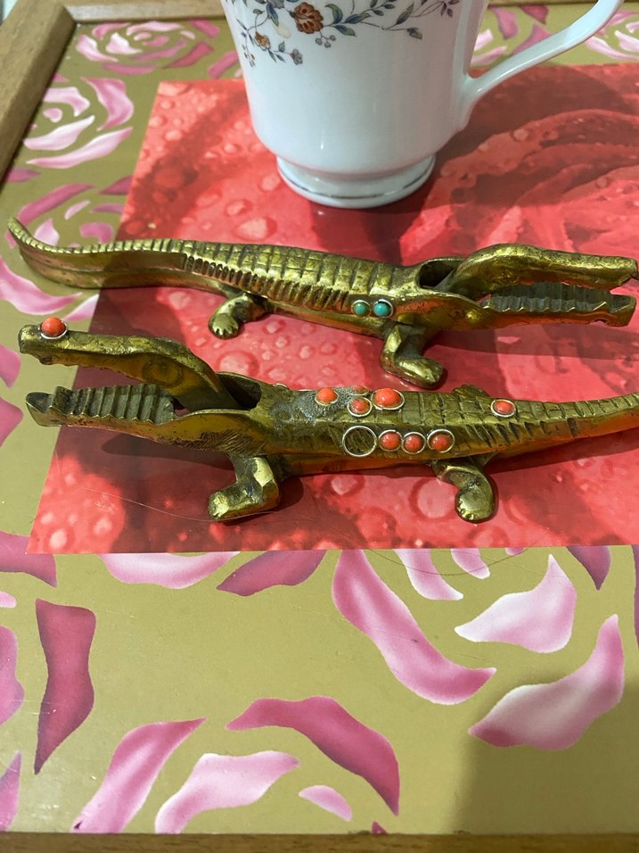 Renkli taşlarla süslenmiş, altın tonunda canlı timsah fındık kıracakları , antika , büyükanneden kalma .
