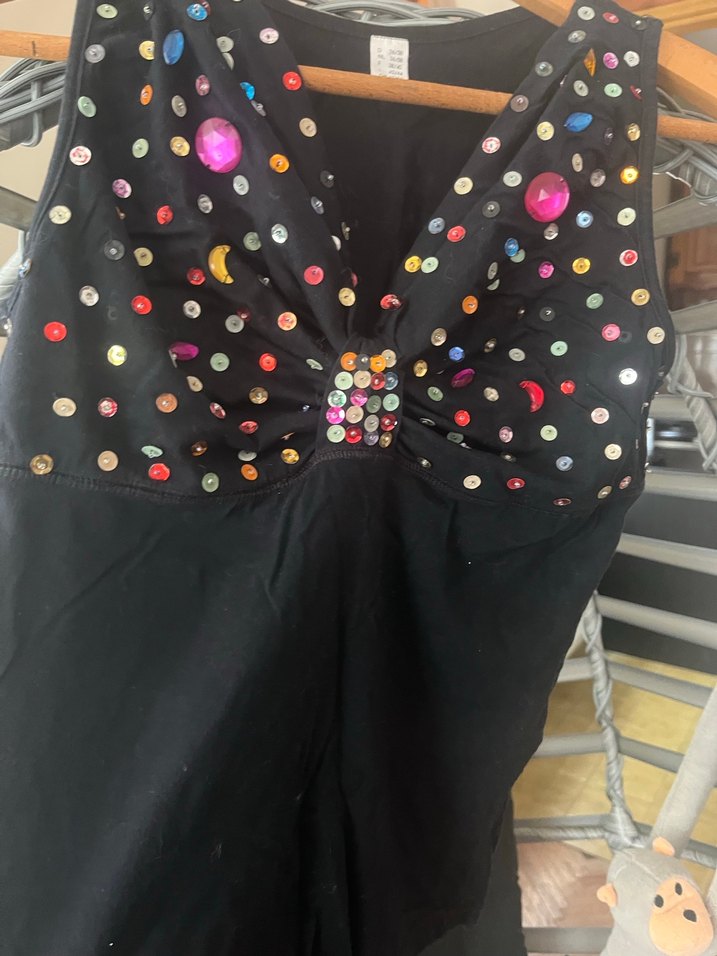 V yakalı ve çok renkli taşlı detaylara sahip siyah bluz. Askılı kollu, midi boyda ve bohem, gotik tarzda parti için uygun.