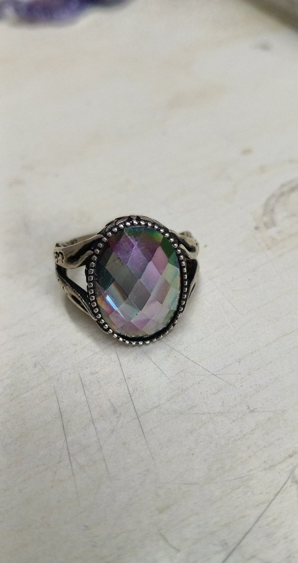 Renkli, kesimli taşın vintage tarzı detaylı bir bant üzerine yerleştiği bohem erkek yüzüğü.