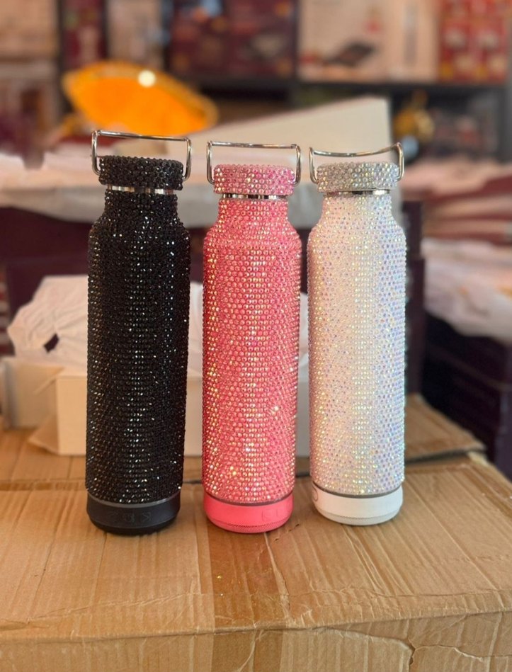 Siyah, pembe ve beyaz renklerde, taşlarla süslenmiş renkli çocuk termos şişeleri. Kolay taşınması için saplıdır. 800 ml