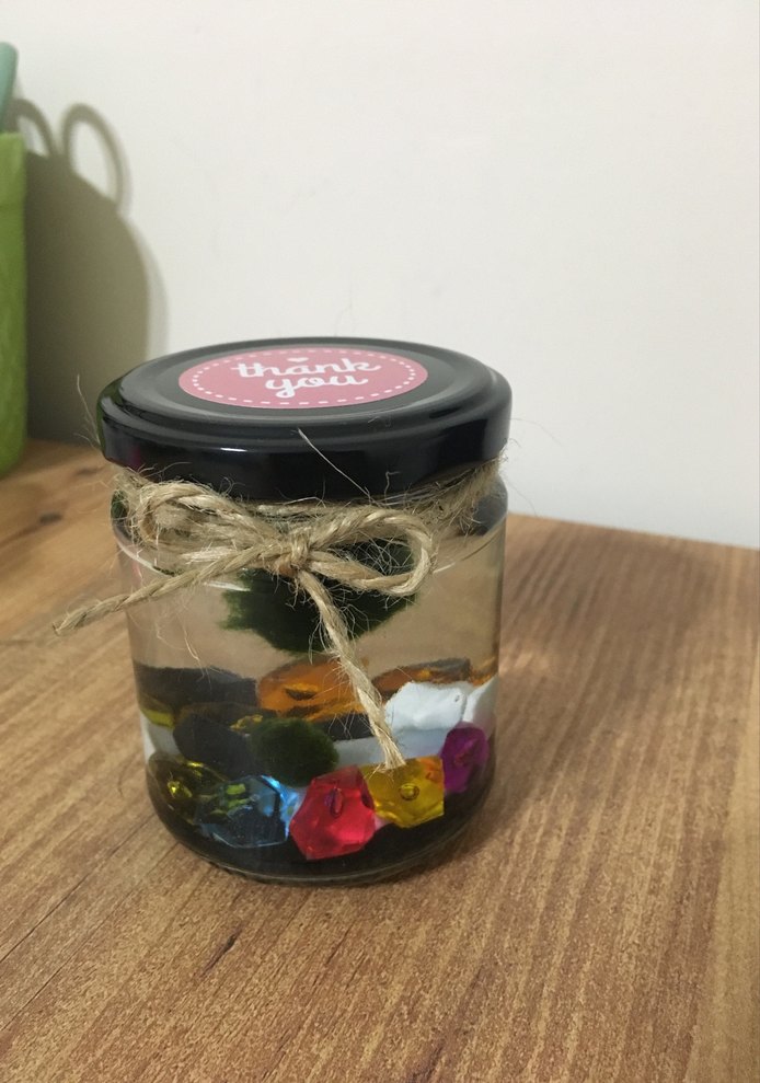 Renkli taşlar içeren, siyah kapaklı ve rustik ip bağlamalı dekoratif balm kavanozu. Hediye veya kişisel kullanım için uygundur.