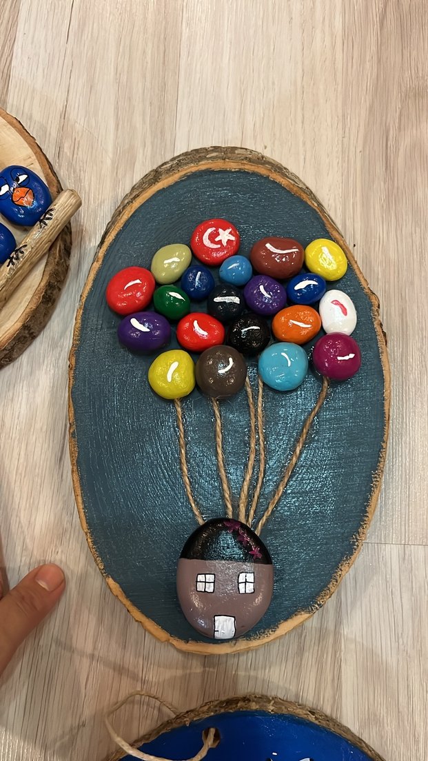Koyu zemin üzerinde, iplerle bağlı renkli taş balonlar ve küçük bir evin yer aldığı ahşap tabanlı tablo.