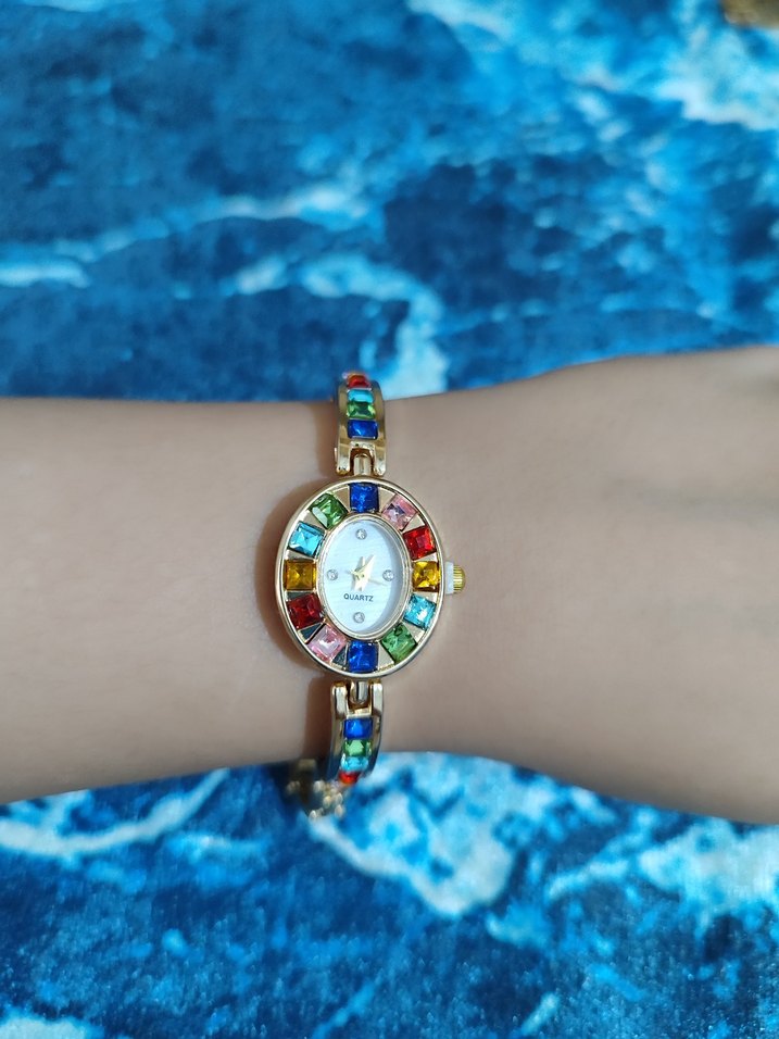 Renkli taşlarla süslenmiş, bilezik ve kadranı taş detaylı, bohem tarza uygun kadın kol saati. ⌚