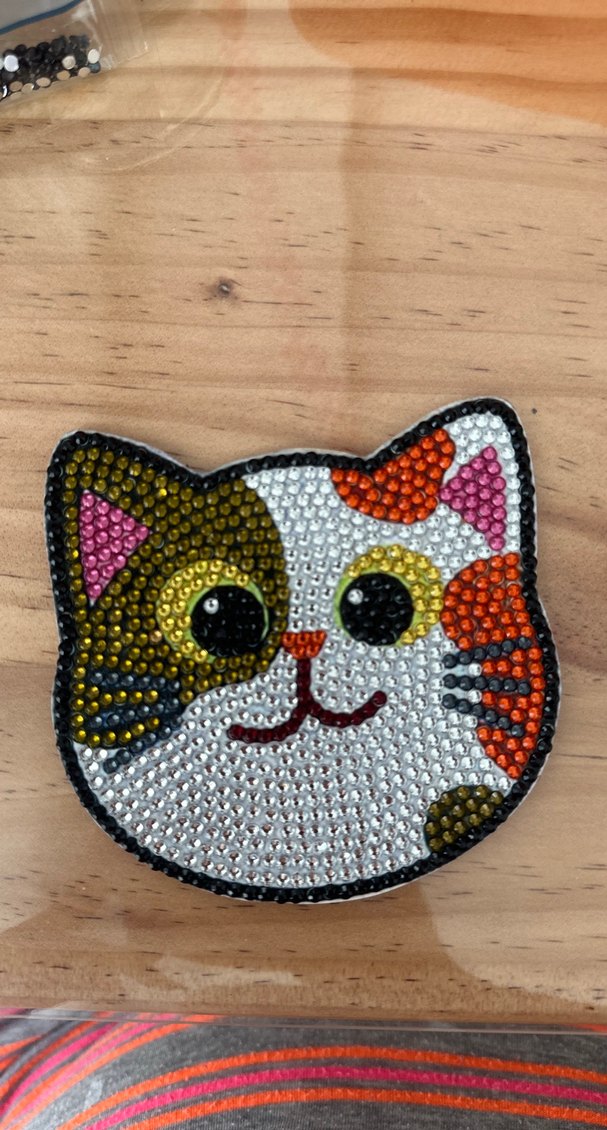 Küçük parlak taşlarla süslenmiş, çok renkli ve eğlenceli kedi figürlü bardak altlıgı