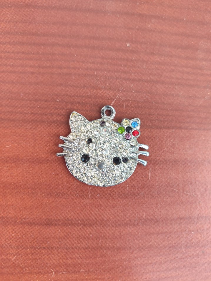 Parlak taşlarla süslenmiş kedi yüzü figürlü, renkli taşlı fiyonk detaylı kedi aksesuarı. Küçük takma halkası bulunur.