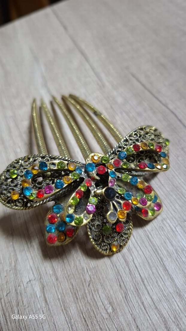 Kelebek şeklinde, renkli taşlarla süslenmiş , vintage ve bohem tarzda saç tokası.
