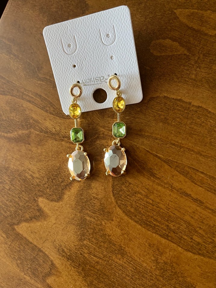 Işıltılı, çok renkli taşlarla süslenmiş midi uzunlukta kadın küpeleri. Bohem tarzıyla romantik akşamlar için uygun.