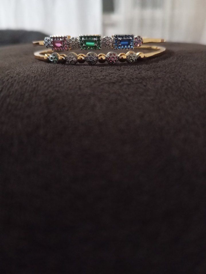 Kadın bileklik, çok renkli parlak taşlarla desenli ve altın tonlu bant üzerinde şık bir görünüm sunar. Romantik geceler için uygundur.