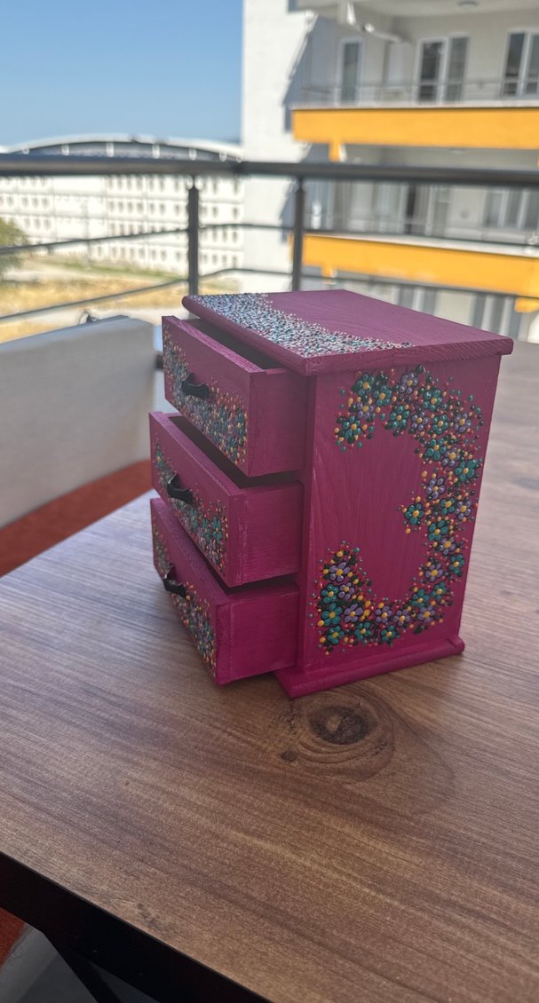 Pembe renkte, renkli taşlarla süslü üç çekmeceli makyaj organizeri, küçük ve dekoratif bir saklama alanı sunar.