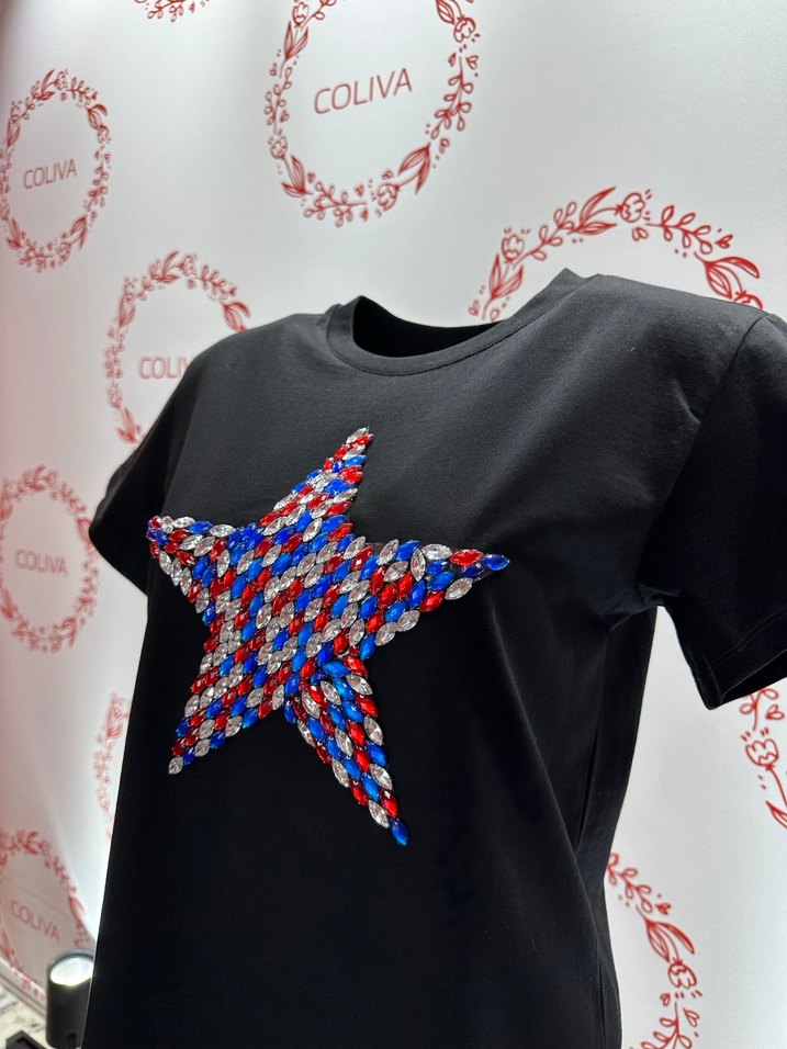 Renkli taşlı yıldız baskılı, kısa kollu, yuvarlak yaka, normal kesim kadın tişörtü. Parti ve sokak stili için ideal. Marka: COLIVA. ✨S-M-L bendenleri ve pembe, mavi, beyaz,siyah renkleri de mevcuttur…✨