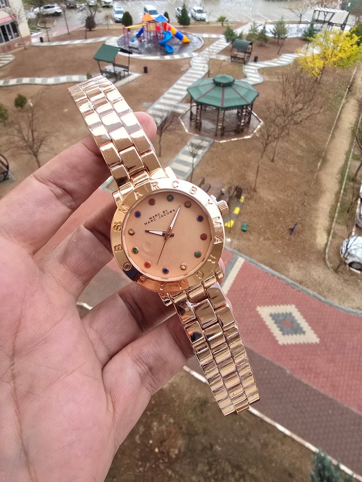 Rose gold metal kayışlı, renkli taşlı kadranlı, tokalı kadın kol saati. Günlük ve iş stiline uygun, modern tasarım. ⌚