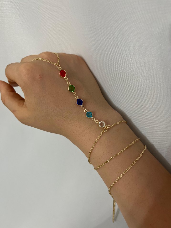 Nakışlı çok renkli taşlar ve ince altın zincirlerle detaylandırılmış kadın el zinciri, bohem tarzını yansıtır. Günlük kullanıma uygundur.