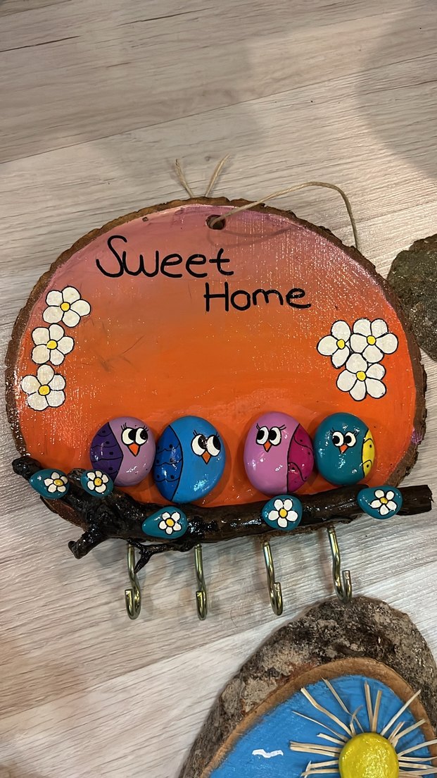 Renkli taşlarla süslenmiş, "Sweet Home" yazılı, kuş ve çiçek desenli duvar askılığı.
