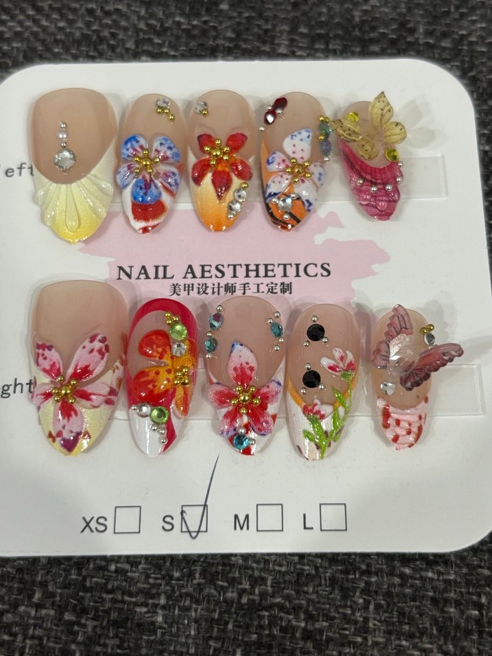 Renkli çiçek ve kelebek desenleri ile taş süslemeli canlı tırnak süslemeleri. Törpü ve bant ile
