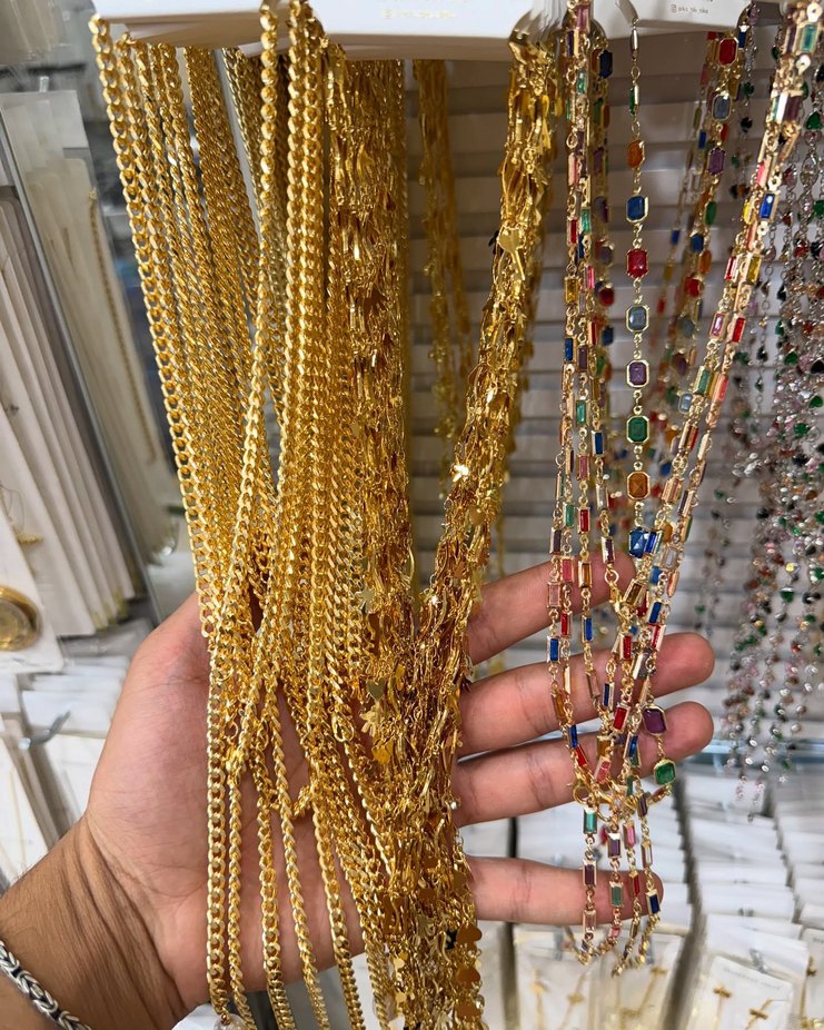 Altın renkli, zincir detaylı ve renkli taşlarla süslenmiş kadın el zincirleri. Bohem tarzda, günlük kullanıma uygun. ✨