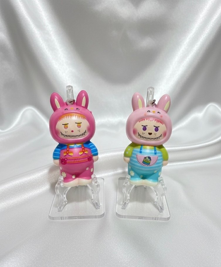 Renkli oyuncak figürler, pembe ve mavi tavşan kostümleriyle, ifadeli yüzlere sahip. Her biri şeffaf bir stand üzerinde duruyor.
