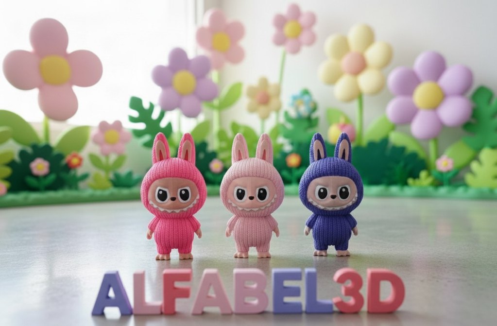 Pembe ve mor tonlarda sevimli tavşan kostümlü renkli aksiyon figürleri. Her figürün ifadeli gözleri ve yumuşak dokusu vardır.