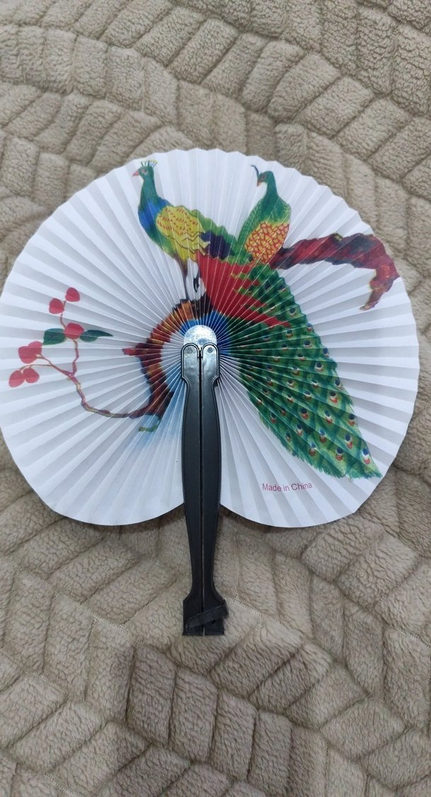 Beyaz zemin üzerine canlı tavus kuşu desenli, katlanabilir siyah saplı renkli yelpaze.