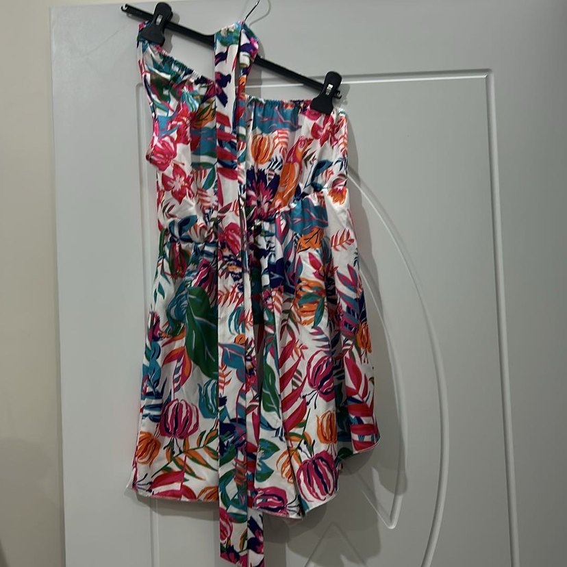 Renkli bağlama desenli, piliseli ve tek omuz kesimli, bol kesim kadın tulumudur. Sentetik kumaştan üretilmiş, günlük kullanım için uygundur. Çok rahat yurtdışından aldım. Belinde kuşak detaylı.