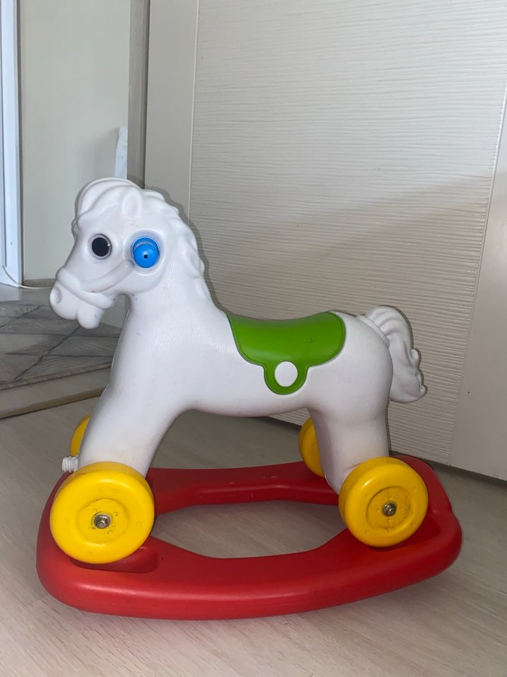 Renkli tekerlekler ve kırmızı tabana sahip beyaz at oyuncak, çocukların binip oynaması için uygundur.