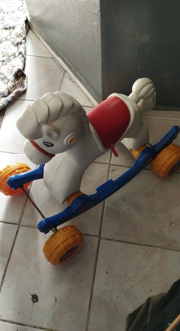 Beyaz gövde, kırmızı eyer ve sarı tekerlekli renkli binme oyuncak at. Dayanıklı mavi tutma kolu bulunur.