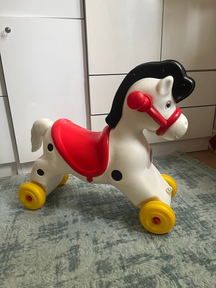 Çocukların binebileceği veya itebileceği renkli tekerlekli beyaz at oyuncak .