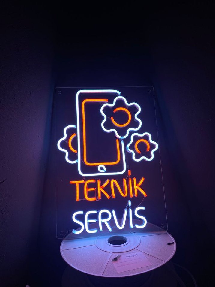 Bu renkli neon tabela, turuncu telefon simgesi ve dişlilerle "TEKNIK SERVIS" yazısını aydınlatır, teknoloji servisleri için uygundur.