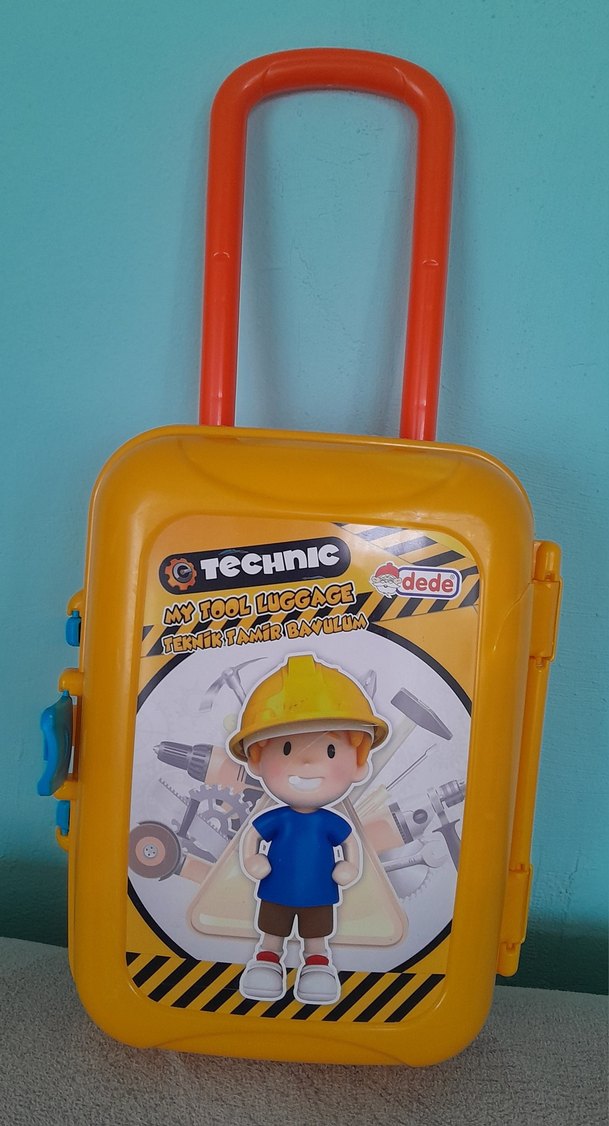 Sarı renkte, teknik tamir temalı, renkli detaylara sahip eğitim oyuncak bavulu. dede markalı ve MY TOOL LUGGAGE etiketli.
