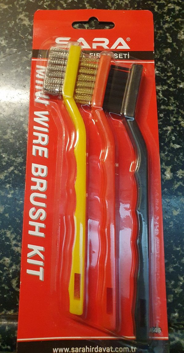 Kırmızı, sarı, turuncu ve siyah plastik saplı üç renkli tel fırça seti. Metal kılları ile etkili temizlik sağlar.