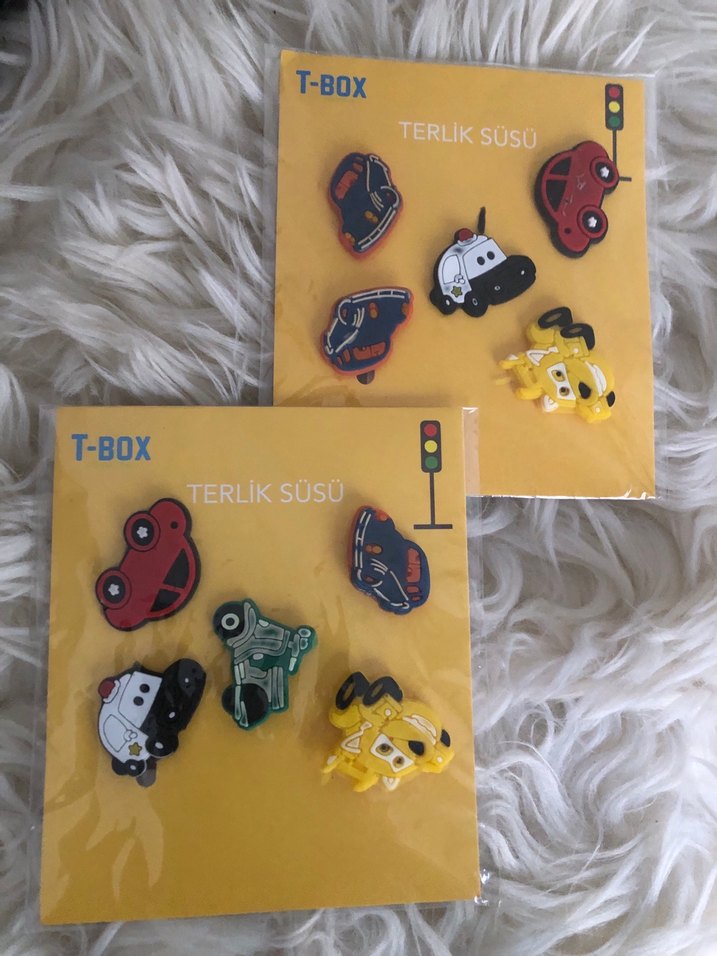 T-BOX markalı, renkli plastikten yapılmış, çeşitli araba desenli düğmeli terlik süsleri. 10 adet