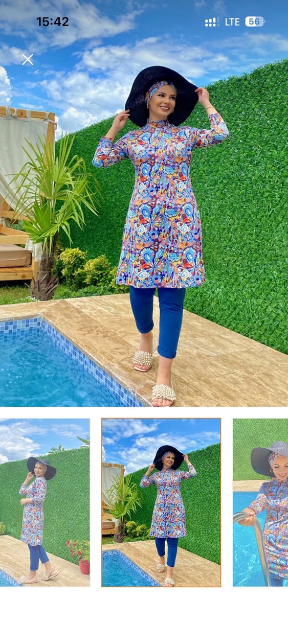 Renkli, uzun kollu, takım şeklinde tesettür mayo. Yüksek yakalı, regular fit ve canlı batik desenli, mayo kumaşı. 2 kez giydim. Toplam 3 parça alt üst ve bonesi. Güncel fiyatları 1200 tl den başlıyor. Hiçbir deformasyonu yok. Remsa mayo