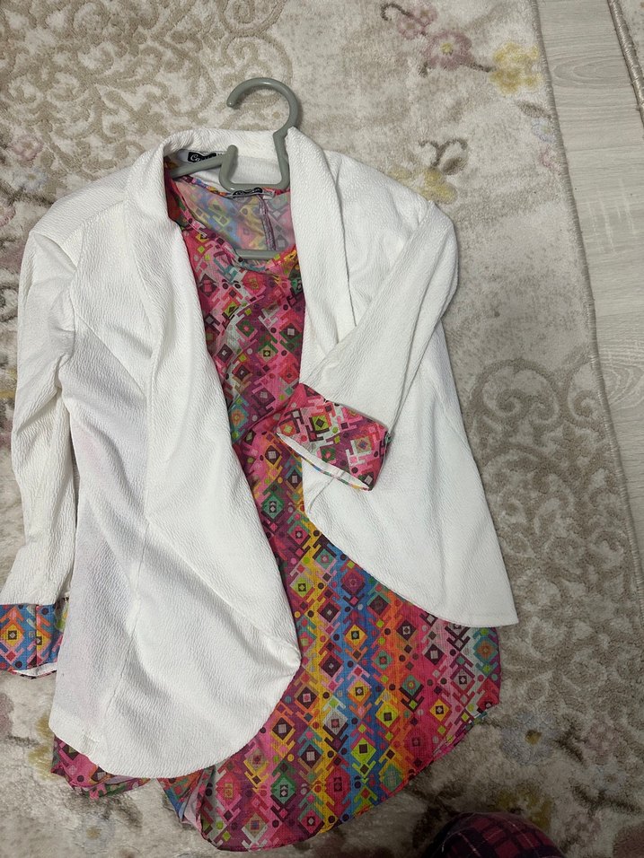 Renkli tie-dye desenli mini blazer, kesik yaka, uzun kollu ve düğmeli. Bohem tarzda, günlük kullanıma uygun, normal kesim.ikili takım içindeki 0 kol ayrıca kombin edebilirsin
