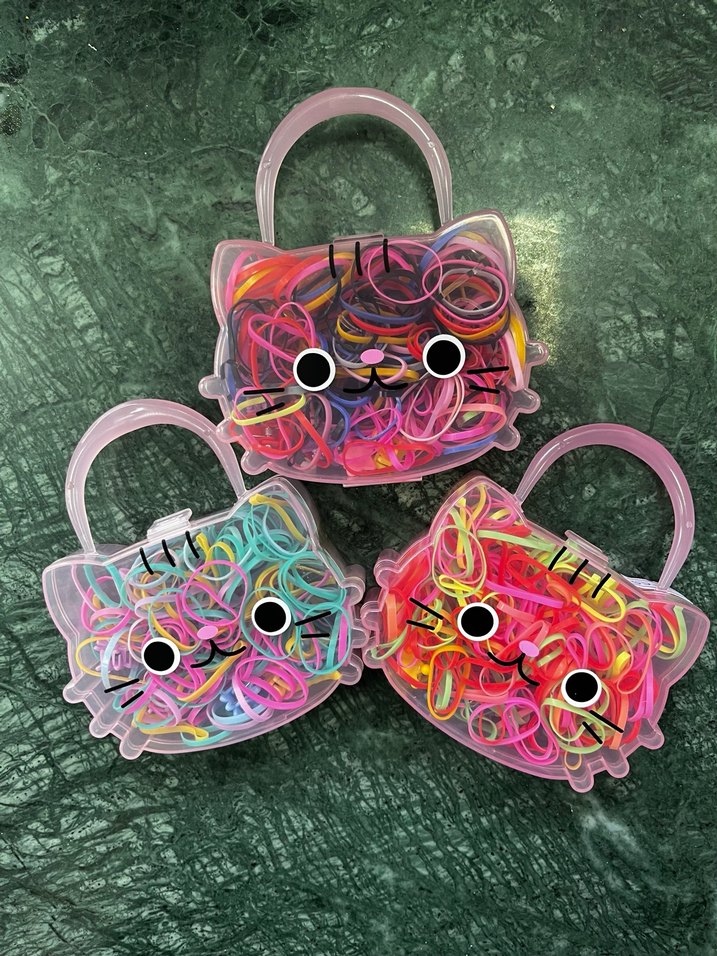 Rock punk tarzına uygun renkli tie-dye desenli elastik saç lastikleri, sevimli kedi figürlü kutularda.