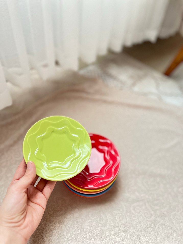 6 adettir. Dalgalı kenarlı, renkli ve tie-dye desenli fincan altlığı seti, sofranıza canlılık katar. ️