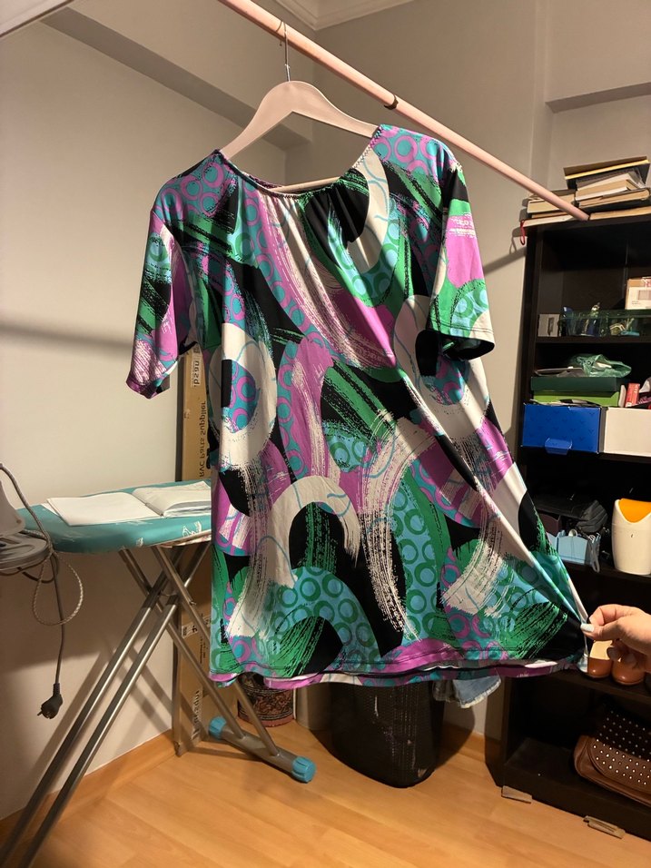 Renkli tie-dye desenli, kısa kollu, bol kesim hamile mini tişört. İpek gibi dokusu, drapeli ve yuvarlak yakalı tasarımıyla günlük kullanıma uygundur.