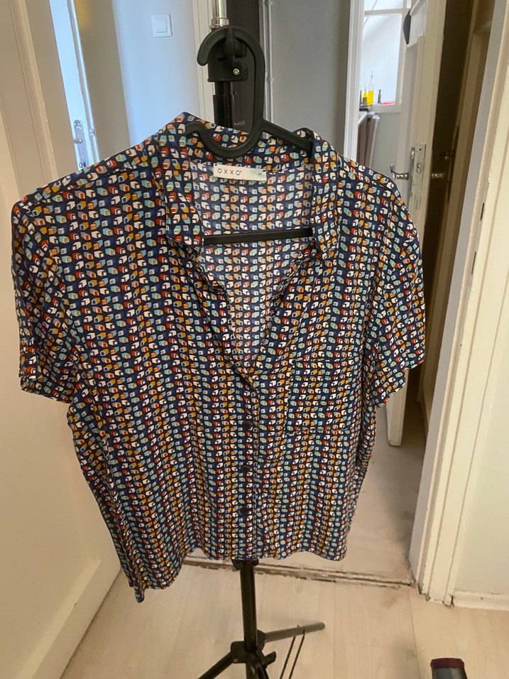 Bol kesim, kısa kollu, yakalı ve düğmeli gömlek. Koyu renkli çok renkli tie-dye desenli tekstil kumaştan, günlük sokak stiline uygun.