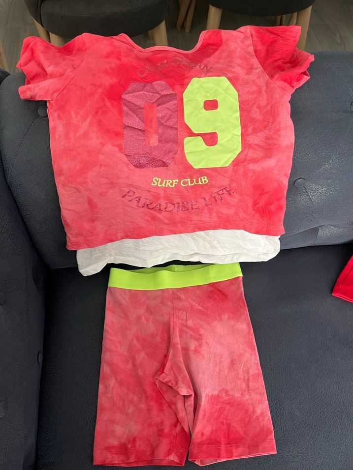 Renkli tie-dye desenli pembe çocuk atlet ve şort takımı, üstte '9 SURF CLUB' yazısı bulunur. Canlı ve eğlenceli tasarıma sahiptir.