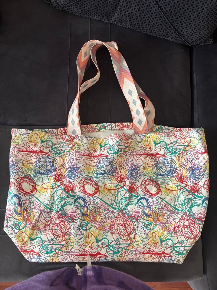 Renkli tie-dye desenli, fermuarlı ve tekstil malzemeden yapılmış kadın çantası. Günlük kullanım için bohem ve avangart tarzda.
