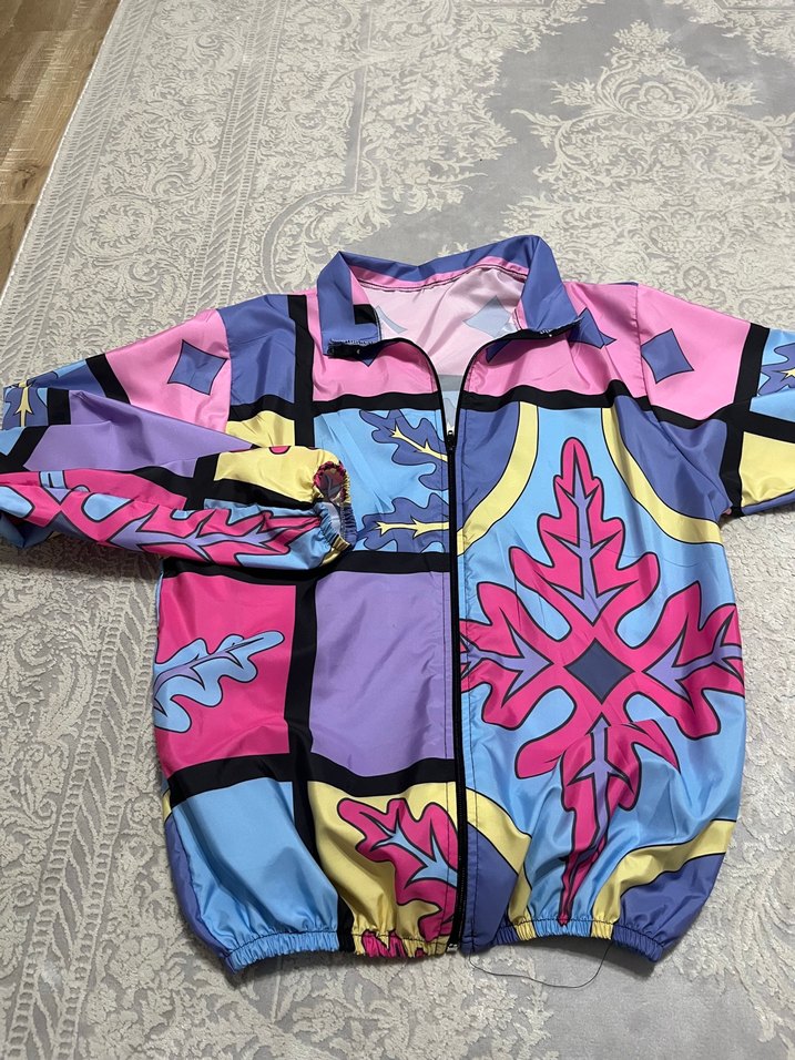 Renkli tie-dye desenli, uzun kollu, yakalı ve fermuarlı kadın ceket. Bol kesim ve ince kumaşlıdır.