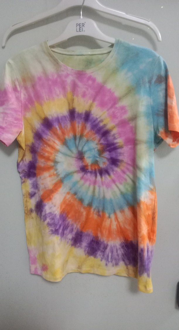 Renkli tie-dye desenli, kısa kollu, yuvarlak yakalı, bol kesim ve fırfır detaylı kadın gömleği. Günlük kullanım için uygundur.