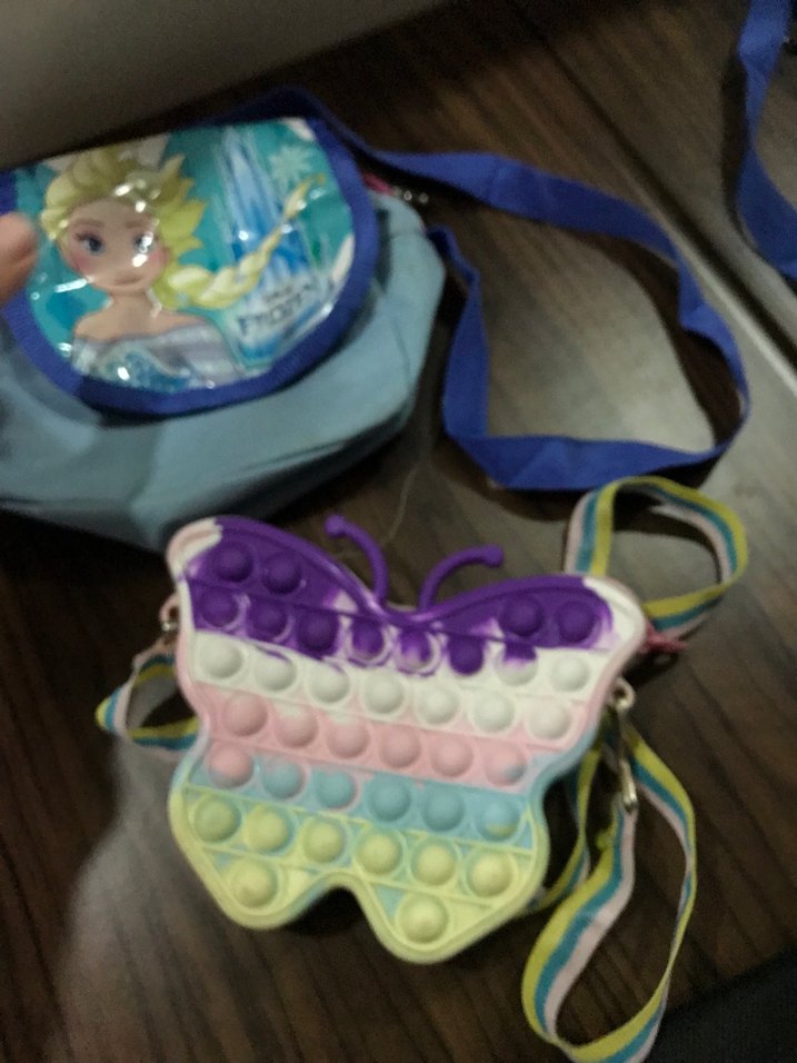 Pastel renklerde tie-dye desenli kelebek şeklinde pop it çanta, boncuk detaylı ve çok renkli askıyla bohem tarzına uygun.
