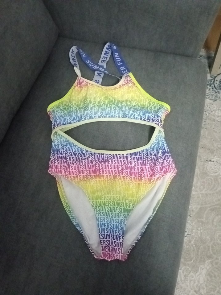 Renkli tie-dye desenli, elastik kumaşlı ve askılı mayokini, cesur plaj kombinleri için ideal.