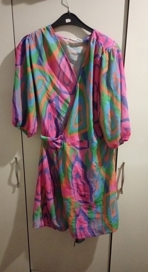 Renkli pastel tie-dye desenli, askılı kollu, bol kesim mini kadın elbisesi. Bohem tarzda rahat bir model.