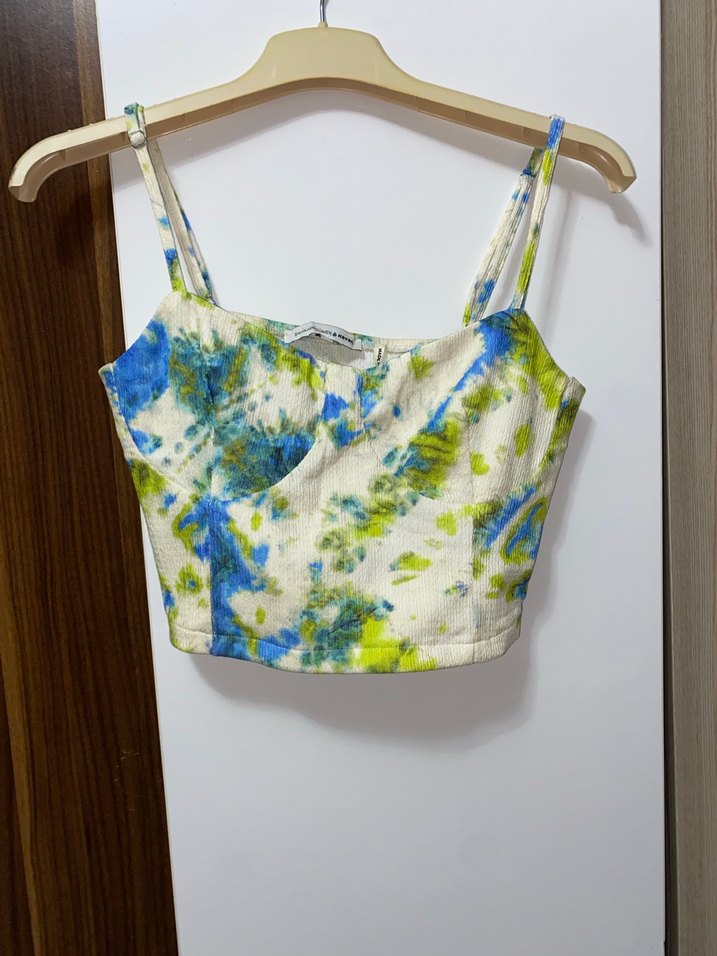 İnce askılı, düğmeli ve renkli tie-dye desenli, sentetik kumaştan yapılmış mini ve vücuda oturan bir büstiyer.