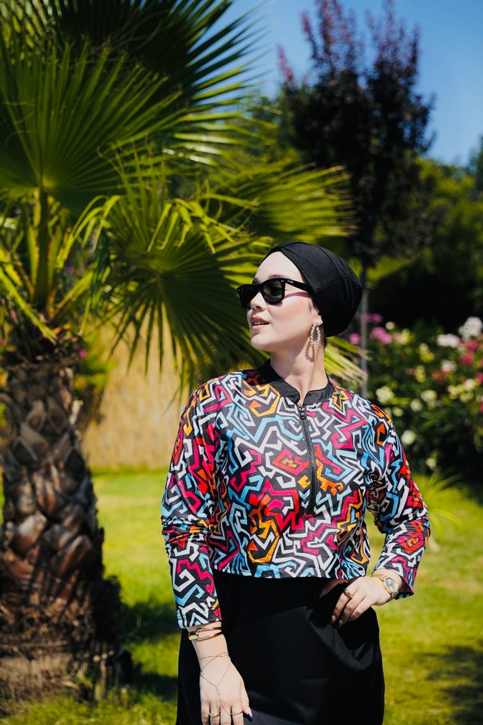 Renkli tie-dye desenli, uzun kollu ve yüksek yakalı kadın tunik. Bol kesim ve mini boyda, sentetik kumaştan, dış mekanlar için rahat ve şık bir seçenek.